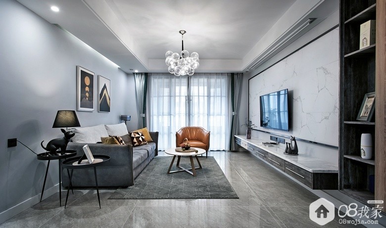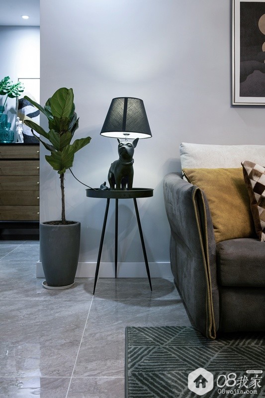 客厅的设计是很现代的感觉,混搭了一点北欧跟港式的元素。石材、金属、布艺,还有大面积灰色的运用,整体感觉就是现在很多人说的“性冷淡”风。通过小狗台灯、绿植、抱枕等软装家具的搭配,在这“冷淡”中又增添了家的趣味跟温馨。