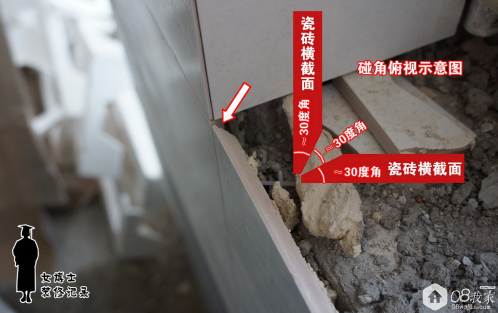 45度碰角其实并不是45度,真正的碰角施工绝对不能真的把瓷砖边缘切成45度,而是30度左右,只有这样,两片瓷砖的角之间才能留有空隙,用以填补砂浆或粘结剂。