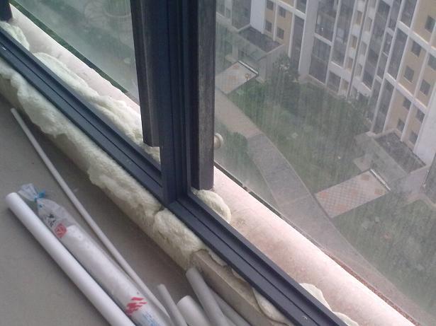 轮到我家装框:没想到封阳台成了一件这么麻烦的事情,幸好我还只是交了部分定金,和老公一起出动,准备对付这个难缠的封阳台的师傅。第一天,约好了他没来,第二天,来了,送了框子,竟然说没带工具,一看就是先前闹了口角的装修队,愤愤不平的走了;第三天,才带了徒弟装框。装完后,我说要先打泡沫胶,打了,不过大家看那图片,浪费的可不是一般的多。最后我说要在外面打上泡沫胶的地方再上防水胶,不干了,说这样怎么可能,这么大个口子,几十瓶防水胶都打不好,要打你自己买胶,我打。什么话,真是!!
