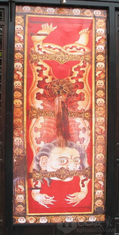 这个大幅的画漂亮吗?呵呵,它可不是普通的画,是西藏的唐卡,挂在一家藏族酒吧和卖工艺品店的外面。
